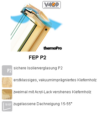 Das Mehrzweck-Ausstieg (2. Rettungsweg) FEP P2 ist mit einer inneren VSG-Verglasung ausgestattet. Die Außenscheibe ist ein Einscheiben-Sicherheits-Glas mit selbstreinigenden Eigenschaften.